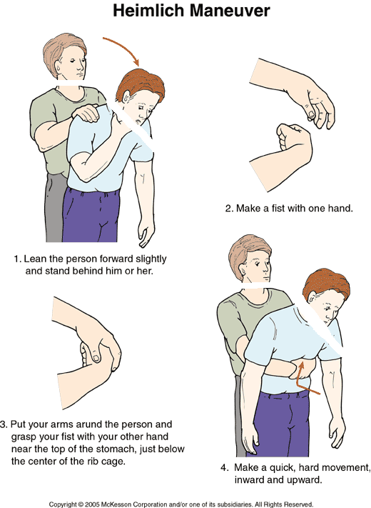 ·لو لم يتمكن الشخص من الإجابة على سؤالك، أو تراه لا يتنفس، أو لا يسعل بالرغم من اختناق الشرقة، فقم سريعاً، ودون أي تأخير، بإجراء ما يُعرف بأسلوب "خمسة وخمسة". أي قم فوراً بإعطاء خمس ضربات بكعب اليد على ظهر المُصاب في المنطقة ما بين الكتفين back blows. · وإذا لم يتحسن الوضع، قم بإجراء "مناورة هيمليك" Heimlich maneuver خمس مرات متتالية. · "مناورة هيمليك" تكون بالضغط والدفع على أعلى البطن. أما إن كان الشخص امرأة حامل أو شخصاً ذا سمنة مفرطة في البطن، فقم بإجراء "مناورة هيمليك" بالضغط والدفع على منطقة الصدر. وسنوضح كامل خطوات "مناورة هيمليك".