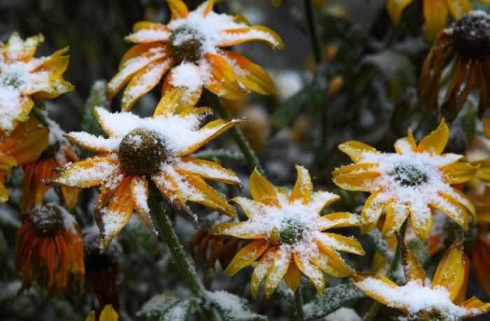 الثلوج تغطي بتلات الزهور في اوبراتش بـ المانيا.