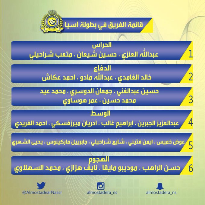 سلمت ادارة نادي #النصر أمس الاثنين الاتحاد السعودي لكرة القدم أسماء لاعبي الفريق الاول الذي سيشارك في دوري ابطال آسيا المقبل