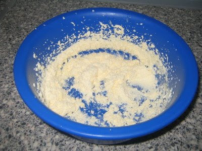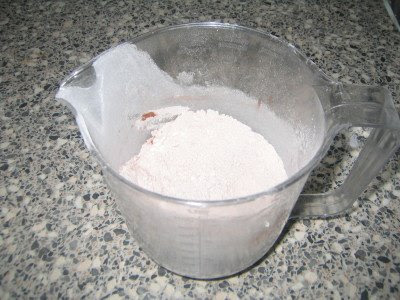 نخلط الطحين والبكنغ باودر والكاكاو ونضيفهم إلى المكونات السابقة