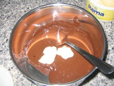 عندما تتماسك جيداً نضيف مزيج الشوكلاتة والزبدة تدريجياً مع مراعاة عدم السخونة التامة للشوكلاتة ،