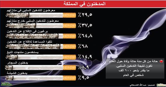 كشفت دراسة حديثة أعدتها وزارة الصحة أن المعرضين للدخان السلبي 29.5 في المائة يعيشون في منازل يدخن فيها الآخرون في وجودهم، و37.5 في المائة يتعرضون لدخان الآخرين خارج منازلهم، و76.5 في المائة يؤيدون حظر التدخين في الأماكن العامة، وبلغ عدد الراغبين في الإقلاع عن التدخين 64.8 في المائة، و68.0 في المائة تلقوا المساعدة للإقلاع عن التدخين، ونسبة انتشار استخدام التبغ بين الشباب انخفضت لمن تتراوح أعمارهم بين 13 و 15 سنة من 19.3 عام 1428هـ إلى 14.9 في المائة عام 1431هـ. ووفق وكيل وزارة الصحة المساعد للطب الوقائي الدكتور زياد ميمش، شملت الدراسة 50 مدرسة من مراحل التعليم المتوسط في المملكة 25 مدرسة ذكور و25 مدرسة بنات، و1715 طالبا منهم 788 ذكور 927 إناث).