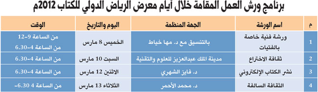 لمزيد من التفاعل مع جمهور معرض الرياض الدولي للكتاب أقرَّت هذا العام أربع ورش عمل للفترة من العصر إلى المغرب. حيثُ يمكن التسجيل فيها في مقر المعرض، لتعميم الفائدة مع ذوي الخبرة والاختصاص كما هو موضح أدنـاه :