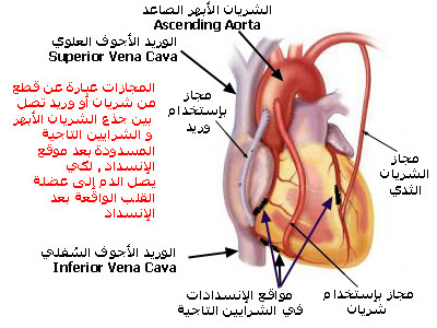 يُستخدم الشريان الثدي الباطن الأيسر Left Internal Mammary Artery كمجازة font color="red"> Bypass للتضيقات القريبة في الشريان التاجي الأمامي النازل الأيسر إن أمكن . لقد إزداد إستخدام الشريان الثدي الباطن الأيمن Right Internal Mammary Artery كمجازة للتضيقات القريبة في الشريان التاجي الأيمن. لا تزال طعوم الوريد الصافن المقلوبة Reverse Saphenous Vein Grafts تُستخدم بشكل شائع بجانب الطعوم الشريانية بالرغم من إنسدادها في 10% من الحالات سنوياً.